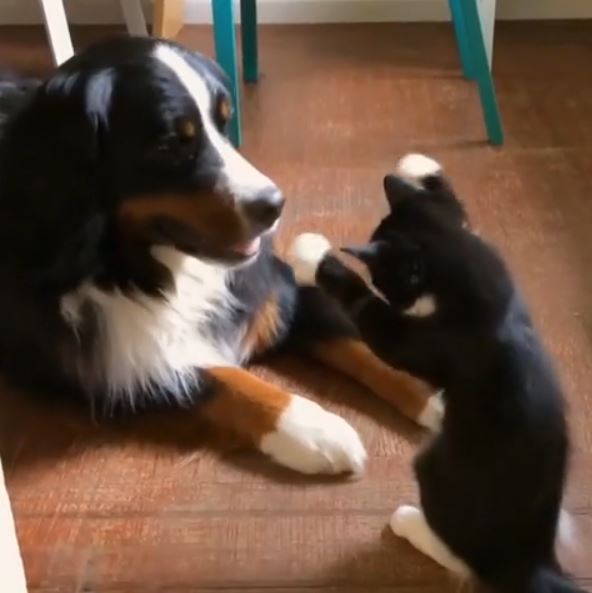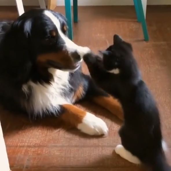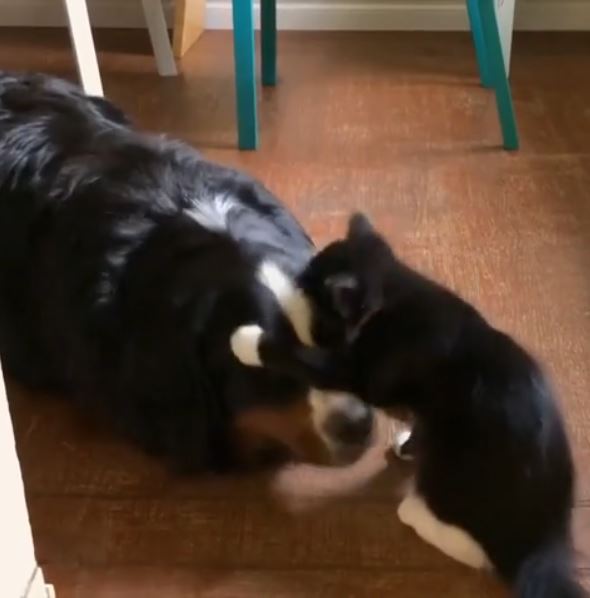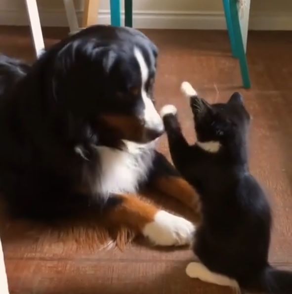 In the video the Bernese Mountain Dog, Beatrix and Midge cat are seen playing together. Well, you can say only the cat is playing and the dog is just anticipating her game.