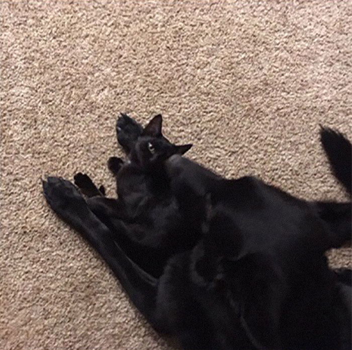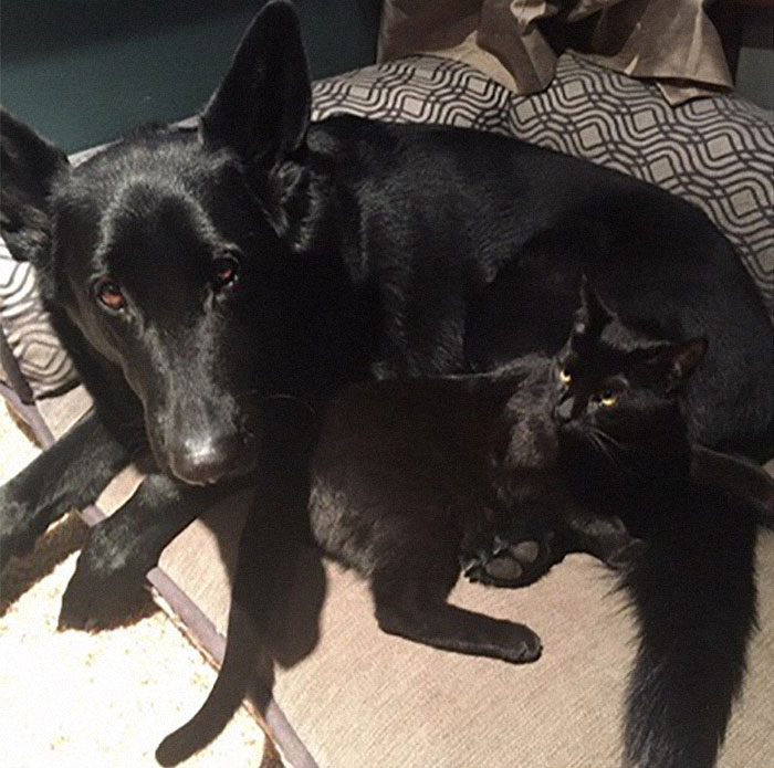 Ever since she was a little baby, the kitty loved to cuddle with Atreyu. He is also a rescue and was beaten, abused, and starved as a pup. So they both enjoy the cuddle equally.