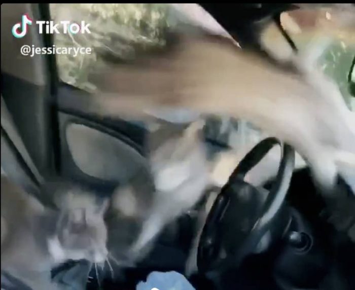 Walking to her mother’s car, Jess was using her phone when she checked the driveway. “I was like, Is that a cat in the windshield?” she expressed. “So I started recording and I snuck up and was like, ‘Oh god!’ when I saw them all in there and they all stood and looked at me when I got to the door and then they started going crazy.”