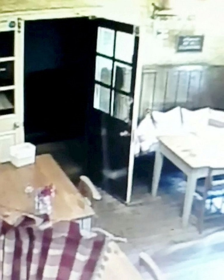 The video was taken from the Lamb and Lion pub and happened while the waitress was clearing tables. A small girl wearing a dress appeared to be walking behind the employee at the time.