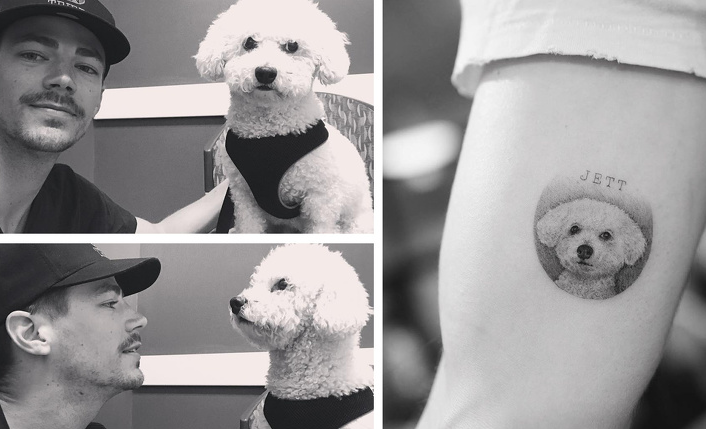Yes, the portrait of the dog on his arm is of his pet dog, Jett.