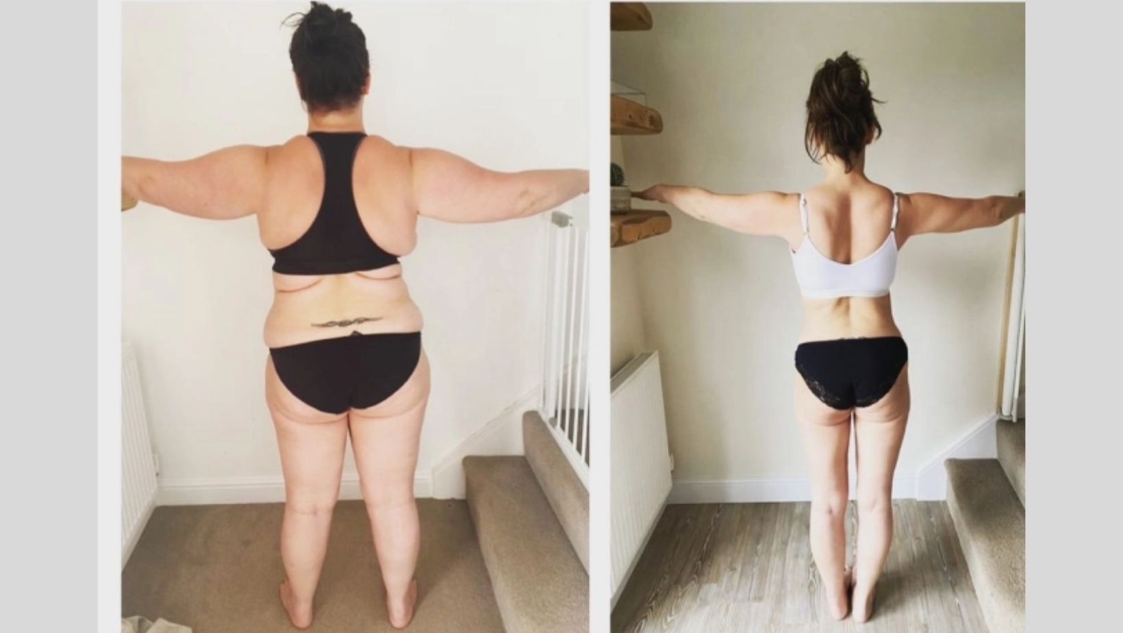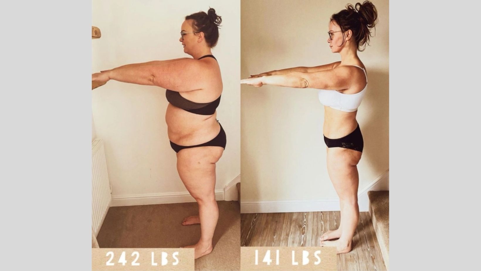 “No holidays abroad for us this year anymore, but Costa del Yorkshire is good enough for us. We had Turkey and Mexico canceled… what about you guys? 🤷🏻♀🤷🏻♀🤷🏻♀ The diff in weight between these pics is 106lbs and dress sizes are 18 and 10”
