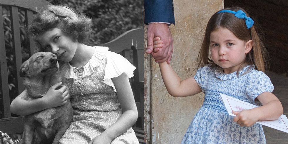 6. The right side photo was taken when Princess Charlotte of Cambridge arrived at Berlin Tegel Airport with her family on an official visit to Germany on July 19, 2017. The left side photo is of young Princess Elizabeth walking with her mother at Edinburgh Castle.