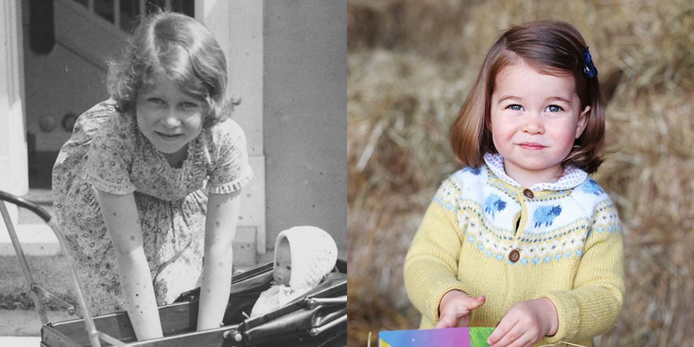 4. The right side photo was taken by Kate Middleton as she snapped this portrait of her daughter at their family home in Norfolk in 2017 in honor of Charlotte’s second birthday. The left side photo shows Princess Elizabeth playing with a pram on the grounds of Windsor Castle circa 1933.