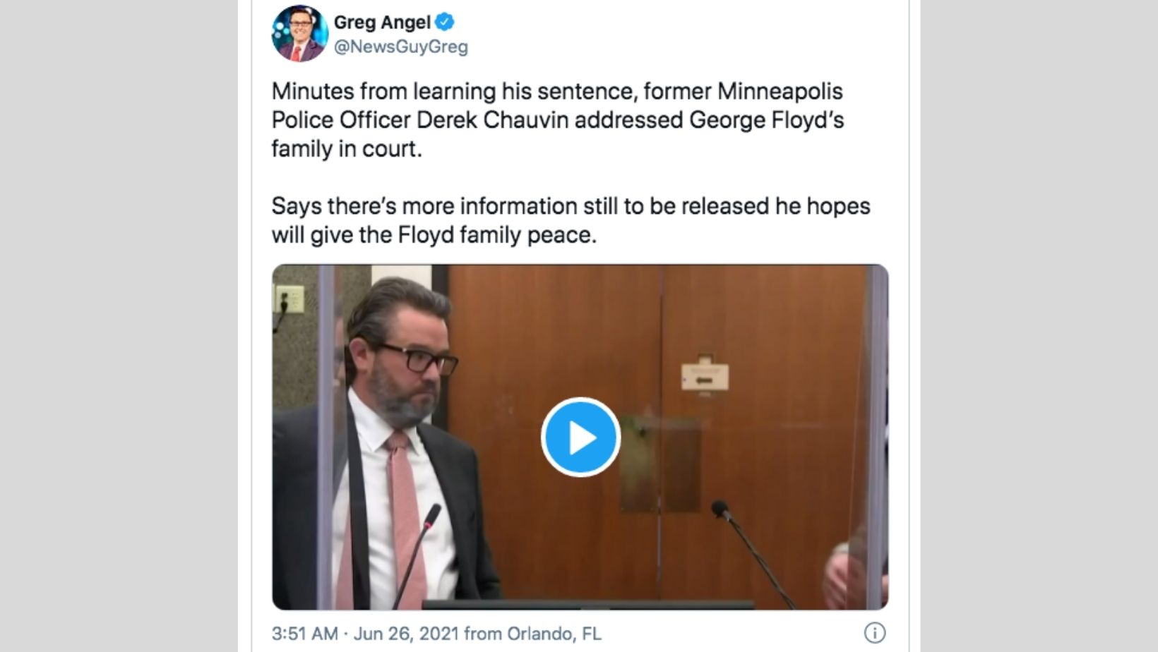 “I am not able to give a full statement at this time, but very briefly, I want to give my condolences to the Floyd family,” Chauvin told Floyd’s family. “There is going to be some other information in the future that will be of interest and I hope things will give you some peace of mind.”