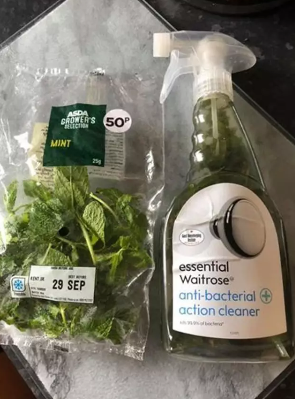 She took a bottle of anti-bacterial cleaner and a pack of mint leaves. Crushed the leaves and added them in the cleaner bottle then added some water to it.