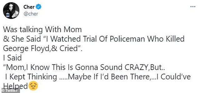 Cher tweets: “Was Talking With Mom & She Said ‘I Watched Trial Of Policeman Who Killed George Floyd,& Cried’. I said ‘Mom,I Know This Is Gonna Sound CRAZY, But.. I Kept Thinking…..Maybe If I’d Been There,…I Could’ve Helped,”