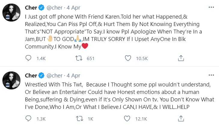 “I Just got off phone With Friend Karen.Told her what Happened,& Realized,You Can Piss Ppl Off,& Hurt Them By Not Knowing Everything That’s‘NOT Appropriate’To Say.I know Ppl Apologize When They’re In a Jam,BUT TO GOD, IM TRULY SORRY If I Upset AnyOne In Blk Community.I Know My [heart emoji],” Cher said.