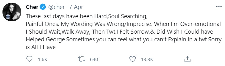 “These last days have been Hard,Soul Searching, Painful Ones. My Wording Was Wrong/Imprecise. When I’m Over-emotional I Should Wait,Walk Away, Then Twt.I Felt Sorrow,& Did Wish I Could have Helped George.Sometimes you can feel what you can’t Explain in a twt.Sorry is All I Have,” the singer tweeted.