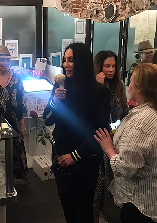Before going home, Cher had some gelato at an Italian ice cream shop. People turned their heads when she walked through the tables and onlookers watched her eat her pudding.