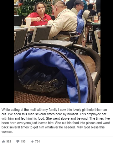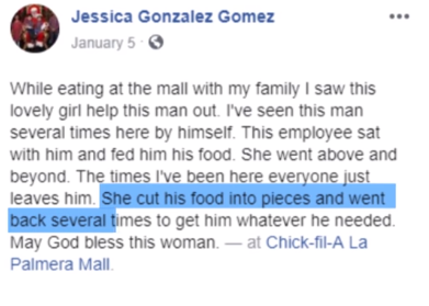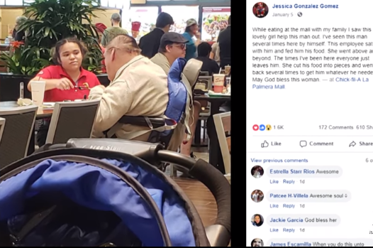 Gomez went on saying that she has seen the man multiple times at the mall. This girl (who was the employee) sat with him to feed him his food- a gesture that shows the above-and-beyond services of Chick-fil-A.