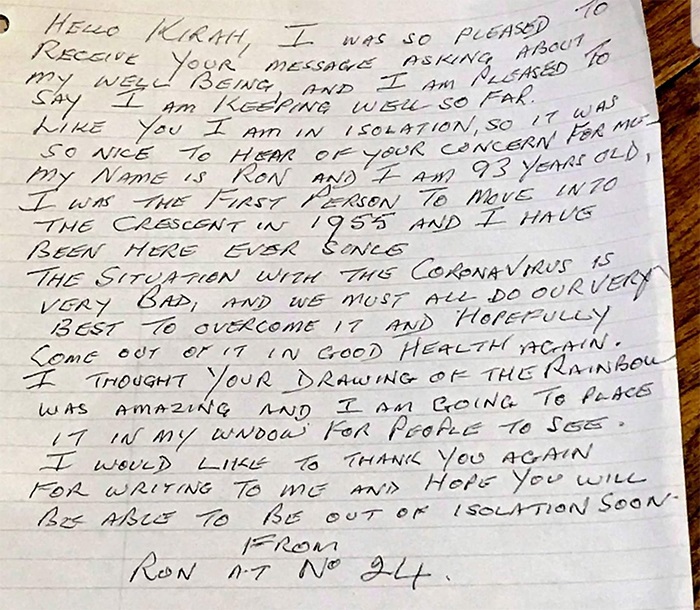 “Like you, I am in isolation, so it was so nice to hear of your concern for me. My name is Ron and I am 93-years-old, I was the first person to move into the Crescent in 1955 and I have been here ever since.”