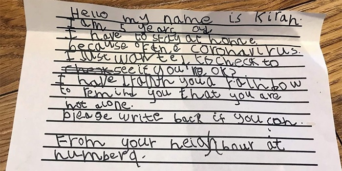 With lockdown measures in place, little Kirah has written a heartwarming message for her elderly neighbor and accompanied it with a rainbow.