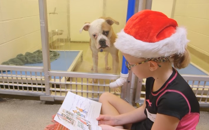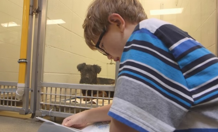 As the mastermind behind the program explained, kids who sign up for the program show up at the shelter and sit in front of dogs’ kennels while reading to them.
