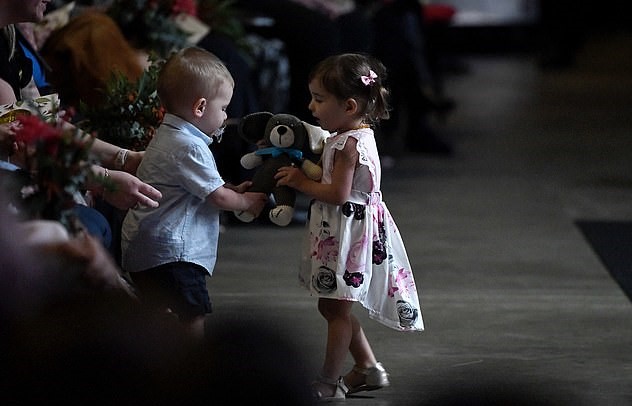 Two young children of firefighters who tragically passed away while battling the flames during Australia’s bushfire crisis were seen sharing a teddy bear during a touching memorial service.