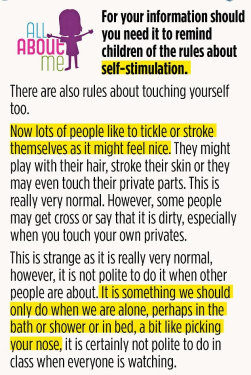 According to documents obtained by The Mail, All About Me classes involve students aged 6 to 10 being told by teachers there are ‘rules about touching yourself.’