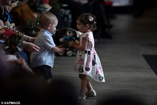 A heartbreaking moment was captured when the children of two volunteer firefighters killed during Australia’s horror bushfire season shared a teddy bear during a poignant memorial service.