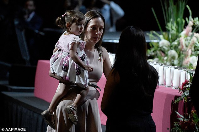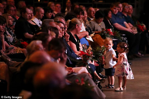 RFS volunteer Geoffrey Keaton’s son Harvey and his truck-mate Andrew O’Dwyer’s daughter Charlotte united during an emotional service at Qudos Bank Arena. Both shared a heart-touching moment.
