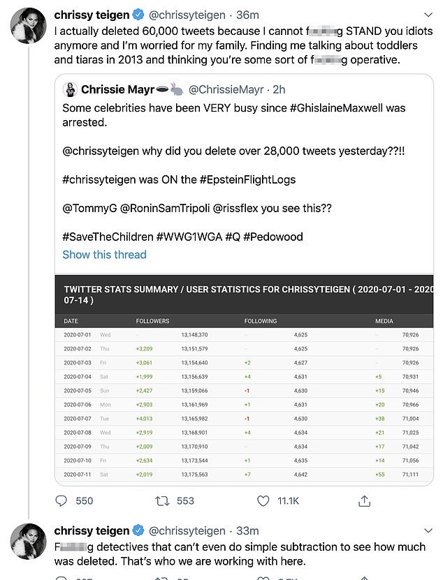 Chrissy Teigen has deleted 60,000 posts on Twitter after wild conspiracy theorists linked her to Jeffrey Epstein.