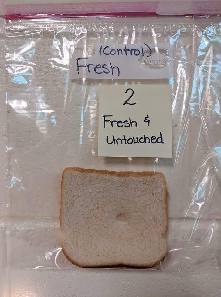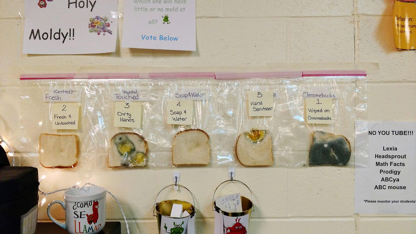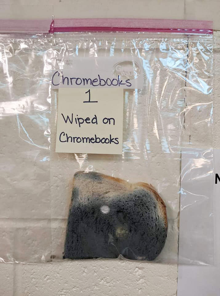 “We did a science project in class this last month as flu season was starting. We took fresh bread and touched it. We did one slice untouched. One with unwashed hands. One with hand sanitizer. One with washed hands with warm water and soap. Then we decided to rub a piece on all our classroom Chromebooks,” she wrote.