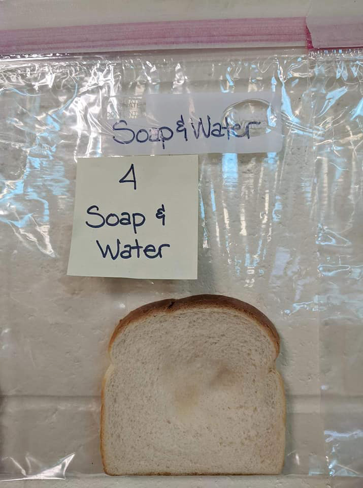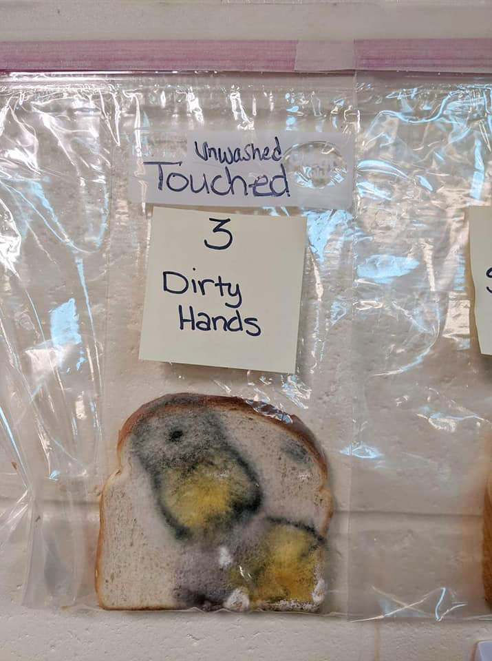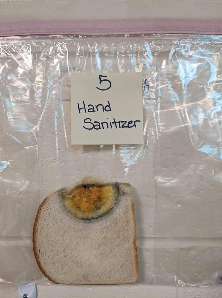 Students touched the pieces of plain bread with dirty hands, washed hands with soap and water and after using hand sanitizer. Then, they sealed the pieces in plastic bags and let them sit for three to four weeks.