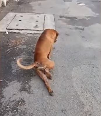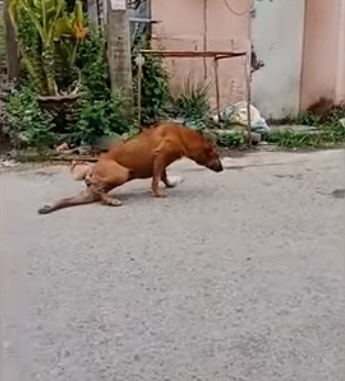 The clever dog, who goes by the name of Gae, always drags his hind legs behind him as if he was in serious pain when walking.