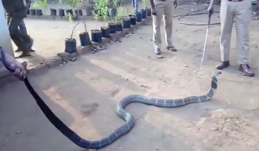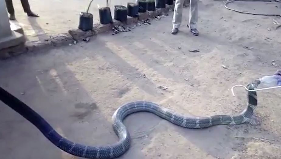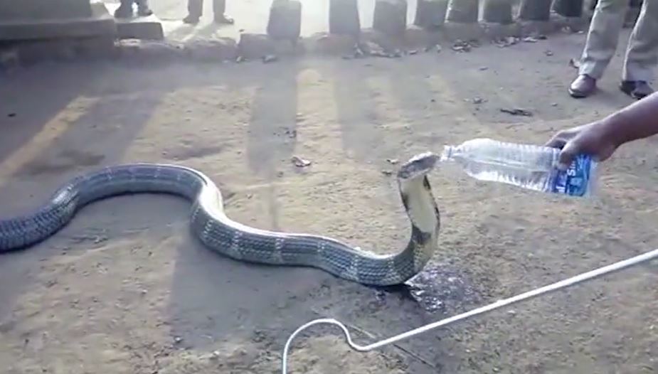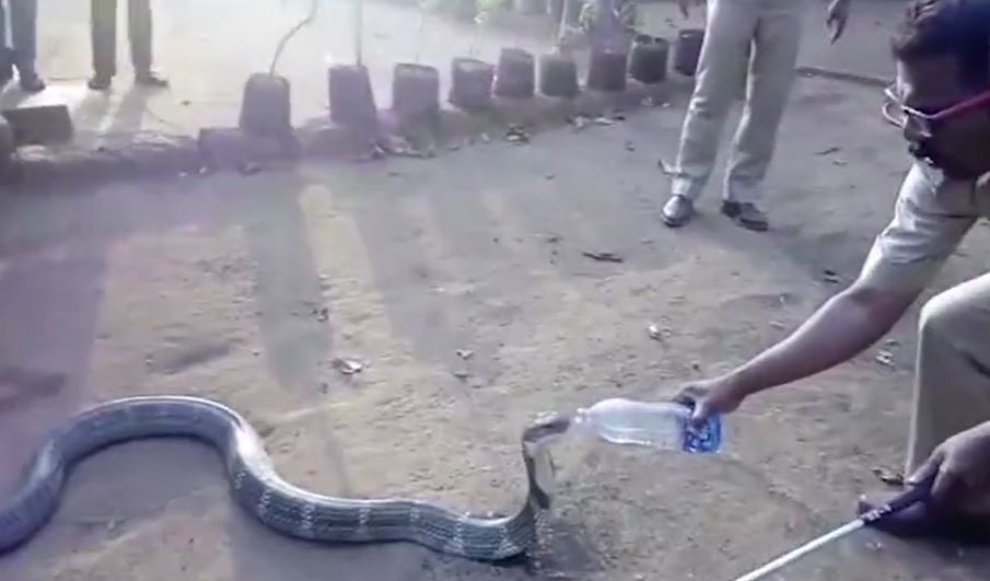 The video shows a king cobra drinking water from the hands of a wildlife officer who showed a great deal of compassion and of course courage in offering water to the most venomous snake in the world.