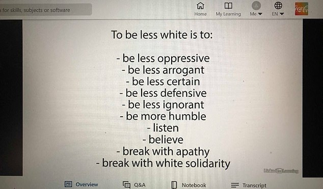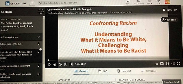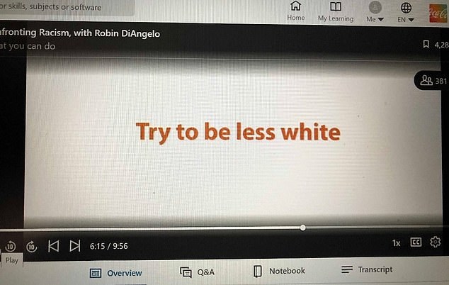 In the video named ‘Confronting Racism with Robin DiAngelo’, the employees were told to be “less white” while whiteness was compared to oppression, arrogance, and a lack of humility.