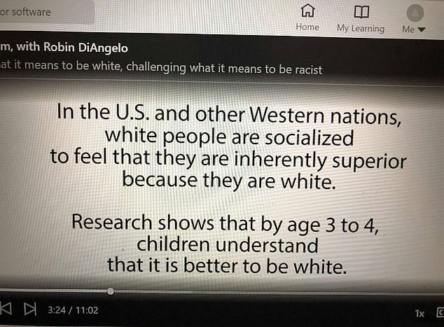“In the US and other Western nations, white people are socialized to feel that they are inherently superior because they are white,” one of the slides read. “Research shows that by age 3 to 4, children understand that it is better to be white.”