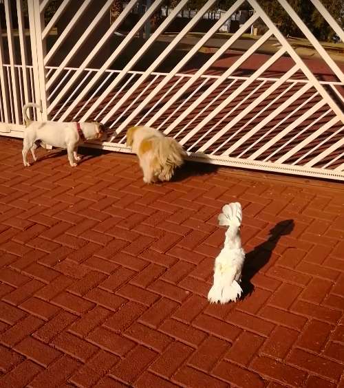 Watch the cockatoo mimicking his dog brothers when they guard the house