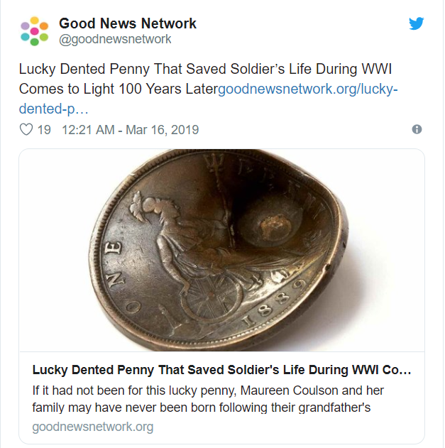 Over 100 years back, Trickett put a penny in his front pocket before going to battle on a French war zone in 1914. He was also keeping it when a German attacked him and the coin got slugged and leaving the fighter handicapped for rest of his life.