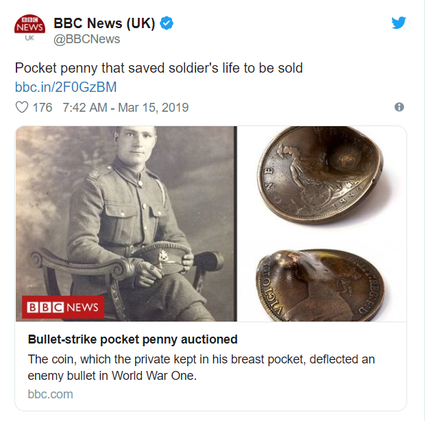 John Trickett was a British soldier who bravely battled in World War 1, always had a coin with him which actually sheathed him from a bullet attack. This coin is now being auctioned along with other war-remembering things of his life.