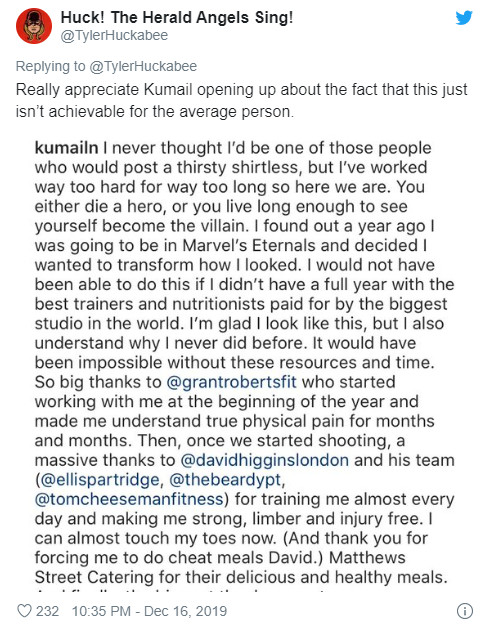 Nanjiani telling people how much it takes to get those massive muscles is really a step in the good direction in guiding the youth.