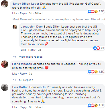 One internet user commented: “Just saw that the US Fire Fighters have arrived and been deployed to help us fight. Thank-you so much, the extent of these fires is devastating. Thanking the families of the US Fire fighters who have graciously let them come help us fight, hope we can return them to you soon.”