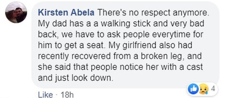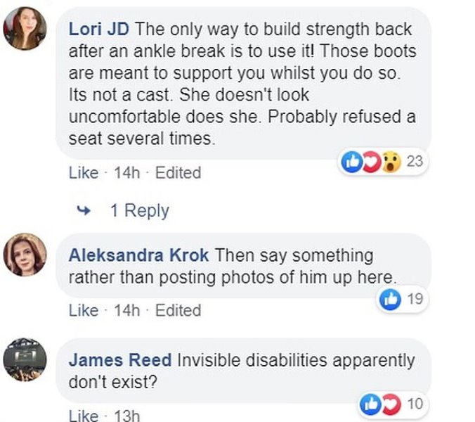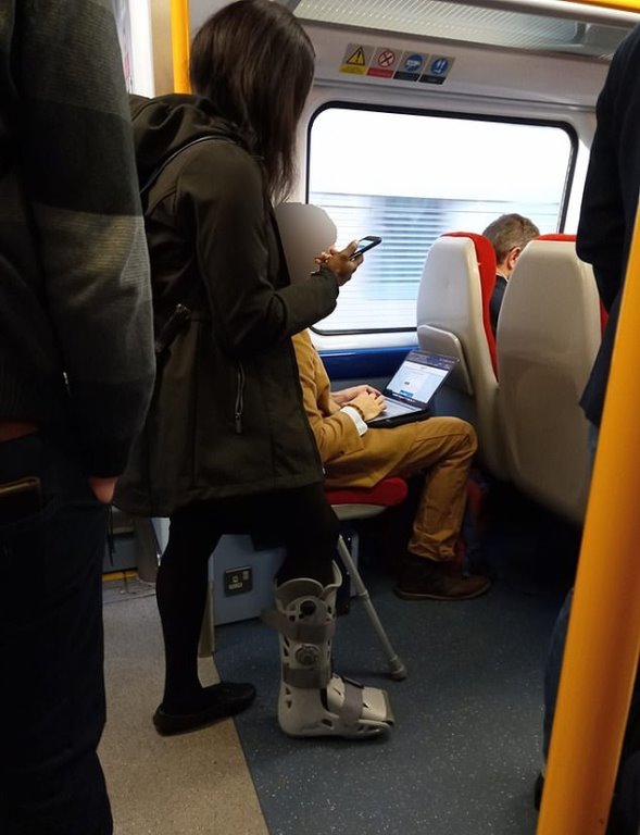 22-year-old Sonny Phillips, who was also standing, took the photo and said the man didn’t offer her a seat even though her lower leg brace was in full view.