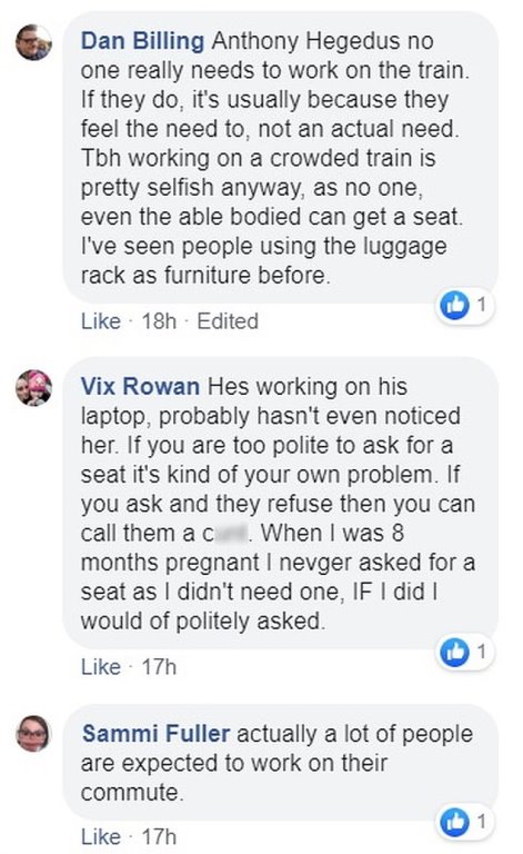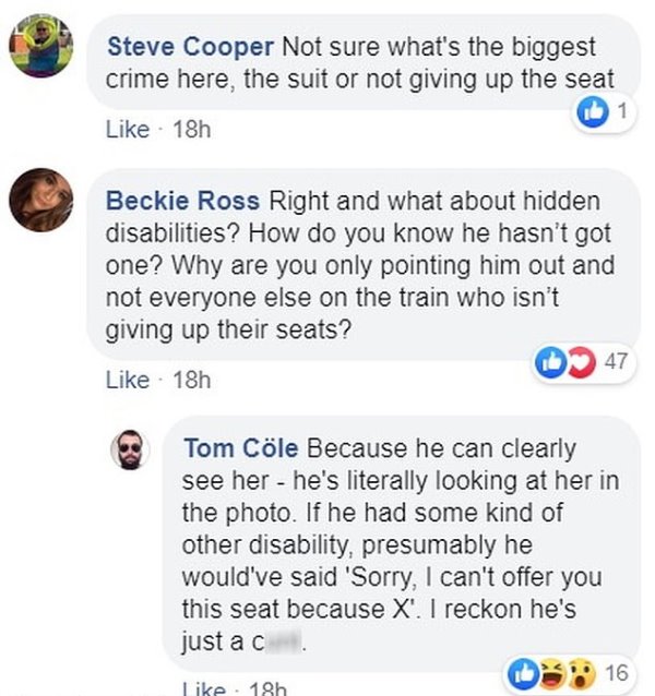 He added: “I’m sure if he had offered her a seat and I hadn’t noticed she would have accepted because later on in the journey I saw someone else offer her a seat and she gladly accepted, so I just assumed he didn’t really care to.