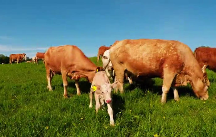 The video shows a calf that was born only a few hours ago wandering on a farm and looking at the man who was filming the moment.