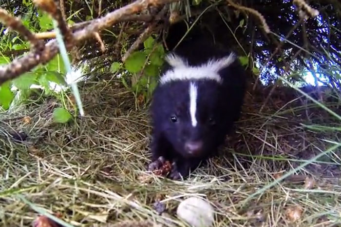 Another clip shows a baby skunk wandering in a field and then hiding under a pine tree after noticing the man filming the moment.