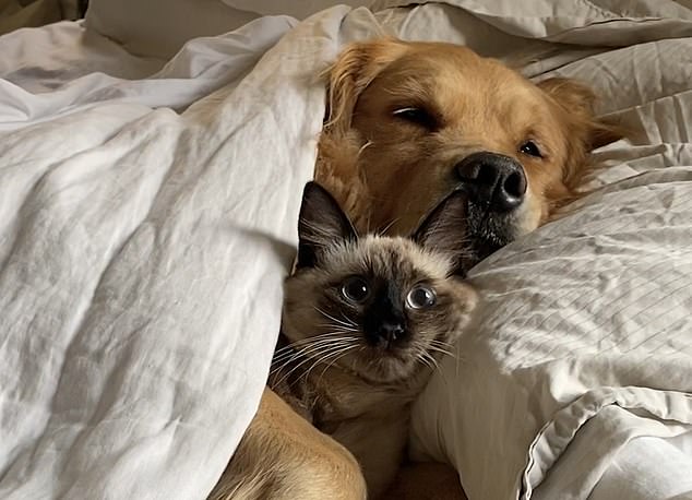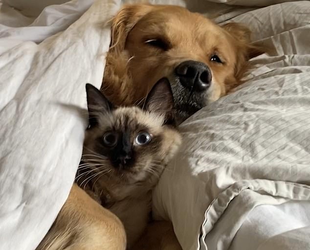 Another wrote: “My Leonardo da Kitty loves to cuddle up with Penelope the Dorkie (dauchshund/yorkie). PePe gives him a through cleaning every night which Leonardo loves. He never will return the favor though!”