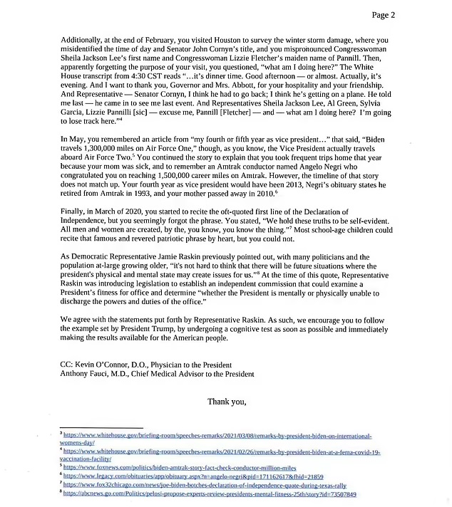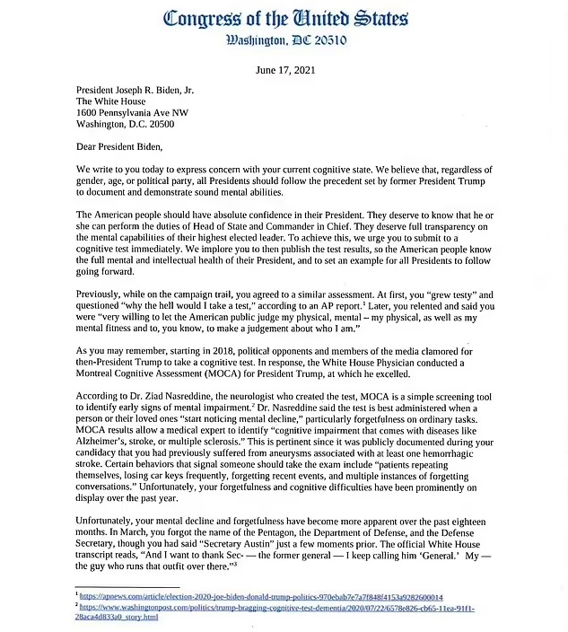 Among other notes presented in the letter, the members of Congress listed several of the President’s so-called gaffes while suggesting that his “mental decline and forgetfulness” is obvious.