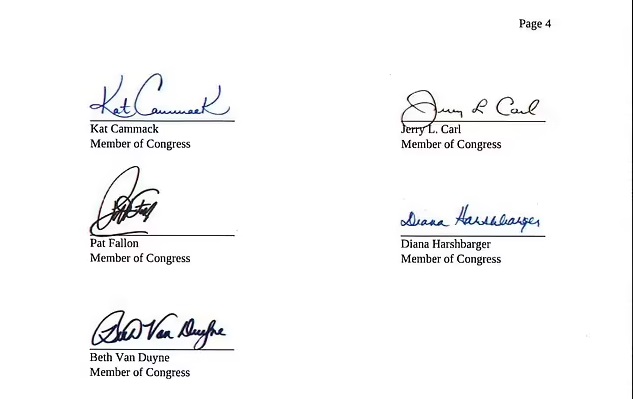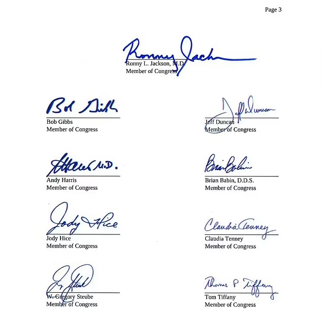 The controversial letter was signed by the former White House doctor, Ronny L. Jackson, and 13 other GOP Congress members including Bob Gibbs, Jeff Duncan, Andy Harris, Brian Babin, Jody Hice, Claudia Tenney, W. Gregory Steube, Tom Tiffany, Kat Cammack, Jerry L. Carl, Pat Fallon, Diana Harshbarger, and Beth Van Duyne.