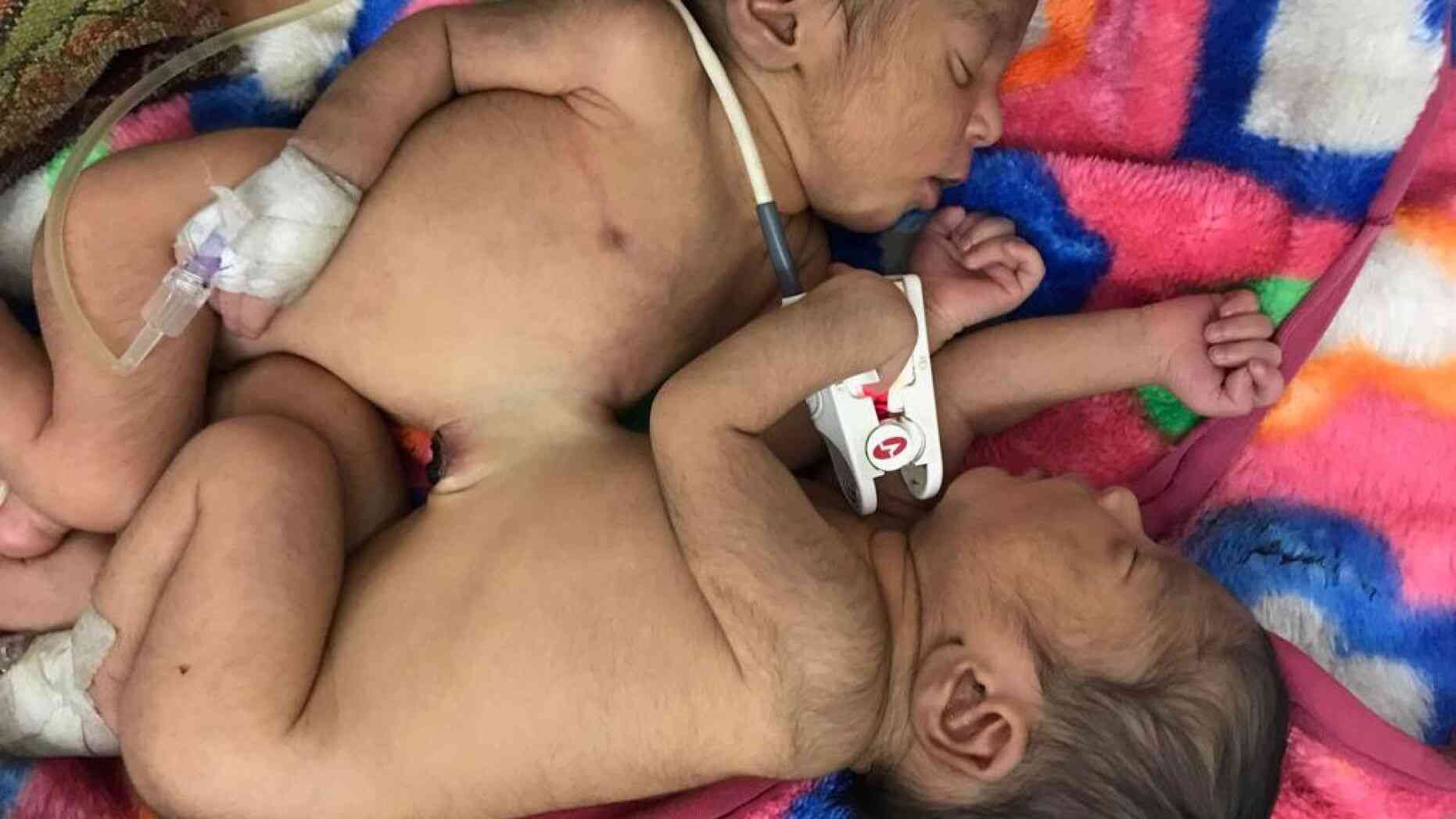 A pair of conjoined twins were born in India who were joined at the tummy and had a combined weight of just 7lbs.