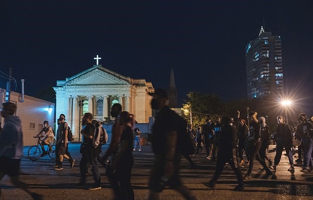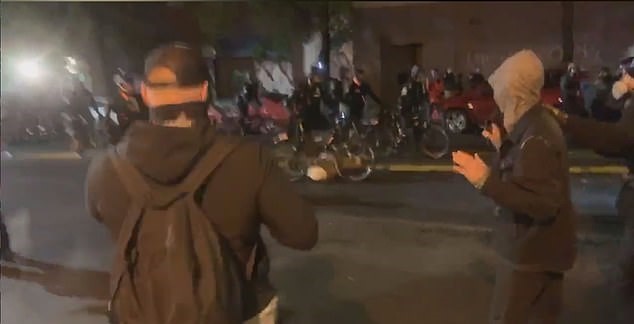 Video shows a wall of police officers walking down the road and pushing bikes on Wednesday night.