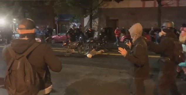 One protester can be seen lying on the road as one Seattle cop wheels a bicycle over his head.