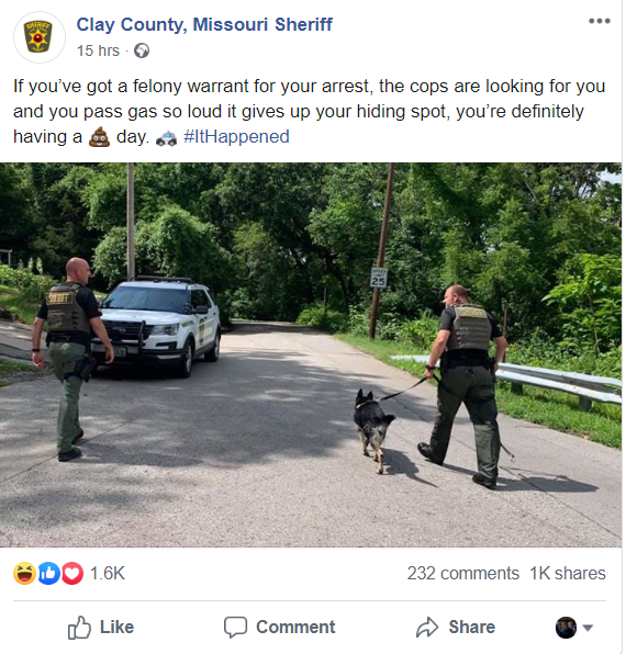 Taking to the force’s official Facebook page, the police wrote: “If you’ve got a felony warrant for your arrest, the cops are looking for you and you pass gas so loud it gives up your hiding spot, you’re definitely having a sh** day.”