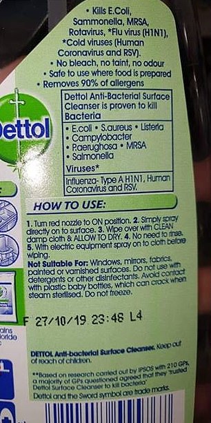 One customer saw that on the back of a Dettol bottle, the description read: “Kills cold viruses (Human Coronavirus and RSV).”
