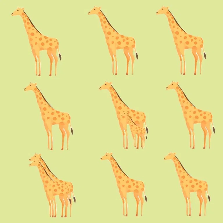 This time, there are 11 animals hiding in the picture. Keep in mind that one giraffe is much smaller than the rest and therefore much harder to spot!