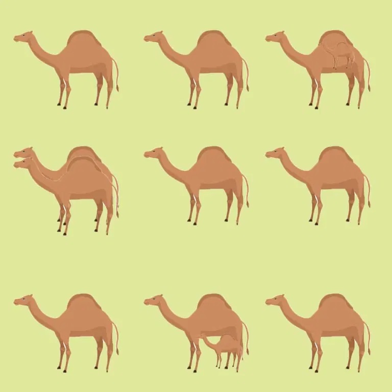 How many animals did you spot this time? Did you notice the tiny camel that’s hiding at the side of its friend?