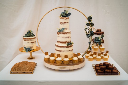 The Lotus Biscoff-themed cake, made by Ellie Stanbury at Kismet Cakes, cupcakes and brownies at the wedding, there was also a homemade piñata filled with individual Lotus Biscoff biscuits.