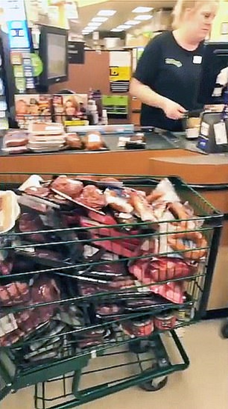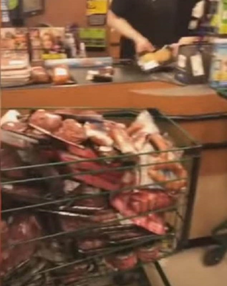 The couple is seen at the checkout line pushing two carts filled to the brim with meat at a time when people around the world have been struggling to just get some basic necessities.